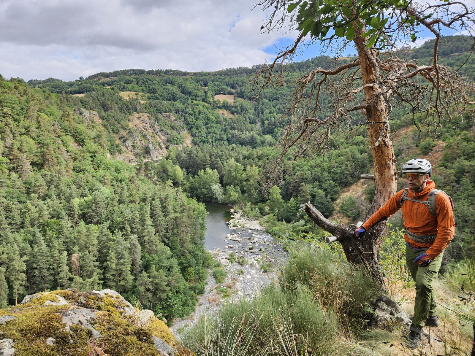 On remonte par un top single (le petite trace du m......r) à flan de falaise (le trou et la Loire en bas, La roche à droite) quelques passages bien tech, contents d'arriver au gite, on commence a avoir mal au c.. et aux cannes.